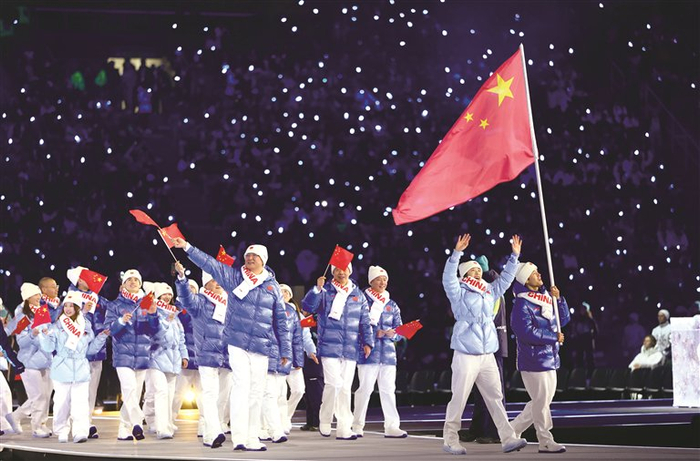 当地时间2月6日,2026年米兰-科尔蒂纳冬奥会开幕式在意大利米兰圣西罗体育场举行。图为中国体育代表团在开幕式上入场。新华社记者 李明 摄