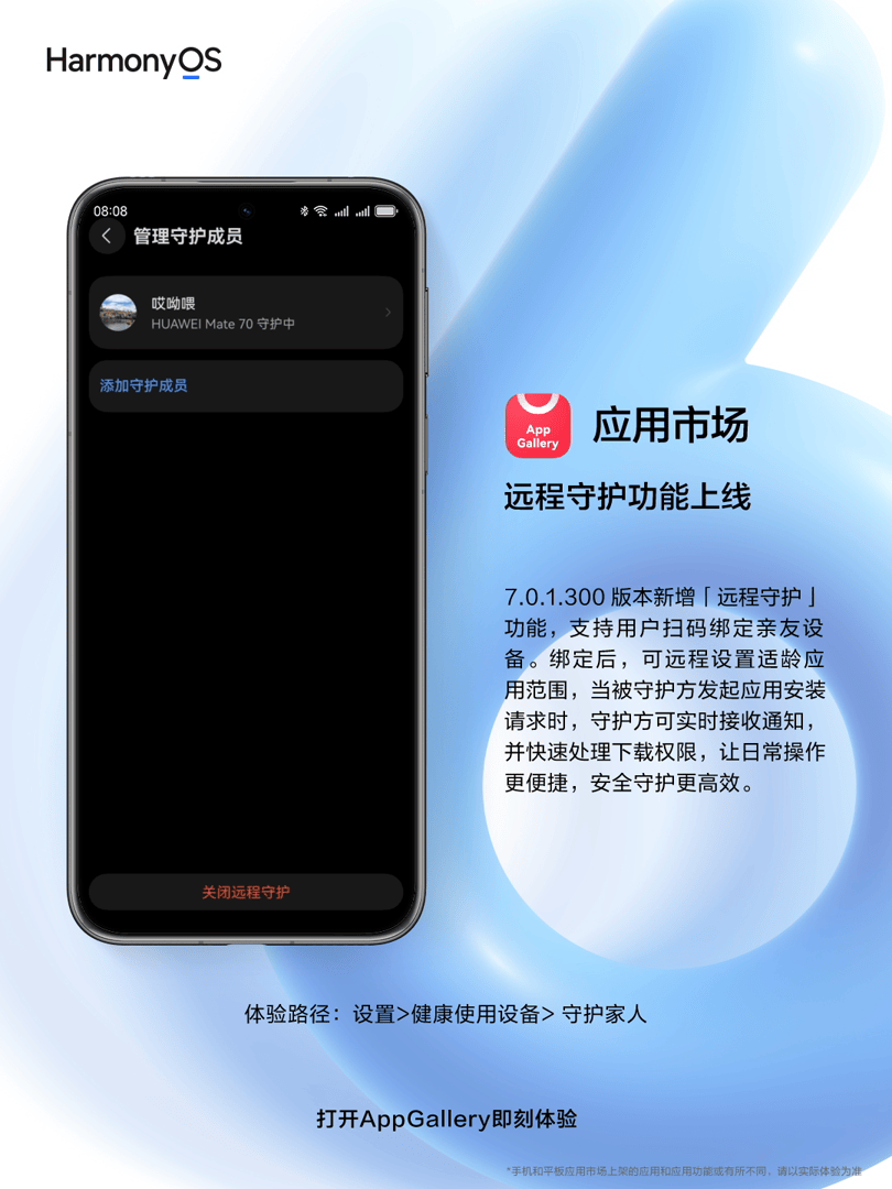 IT之家 2 月 10 日消息,华为终端云服务昨日发文宣布,应用市场 AppGallery 在 7.0.1.300 版本新增了「远程守护」功能,支持亲友间建立守护关系。